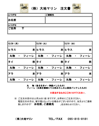 | お渡し | 12月29~31日(8:00~12:00) 弊社活魚センターにてお渡しいたします。 |